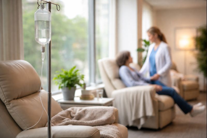 During an infusion, patients are observed in a calm, private setting. Vital signs are tracked. Staff remain present. There is room for stillness, and room for questions afterward.